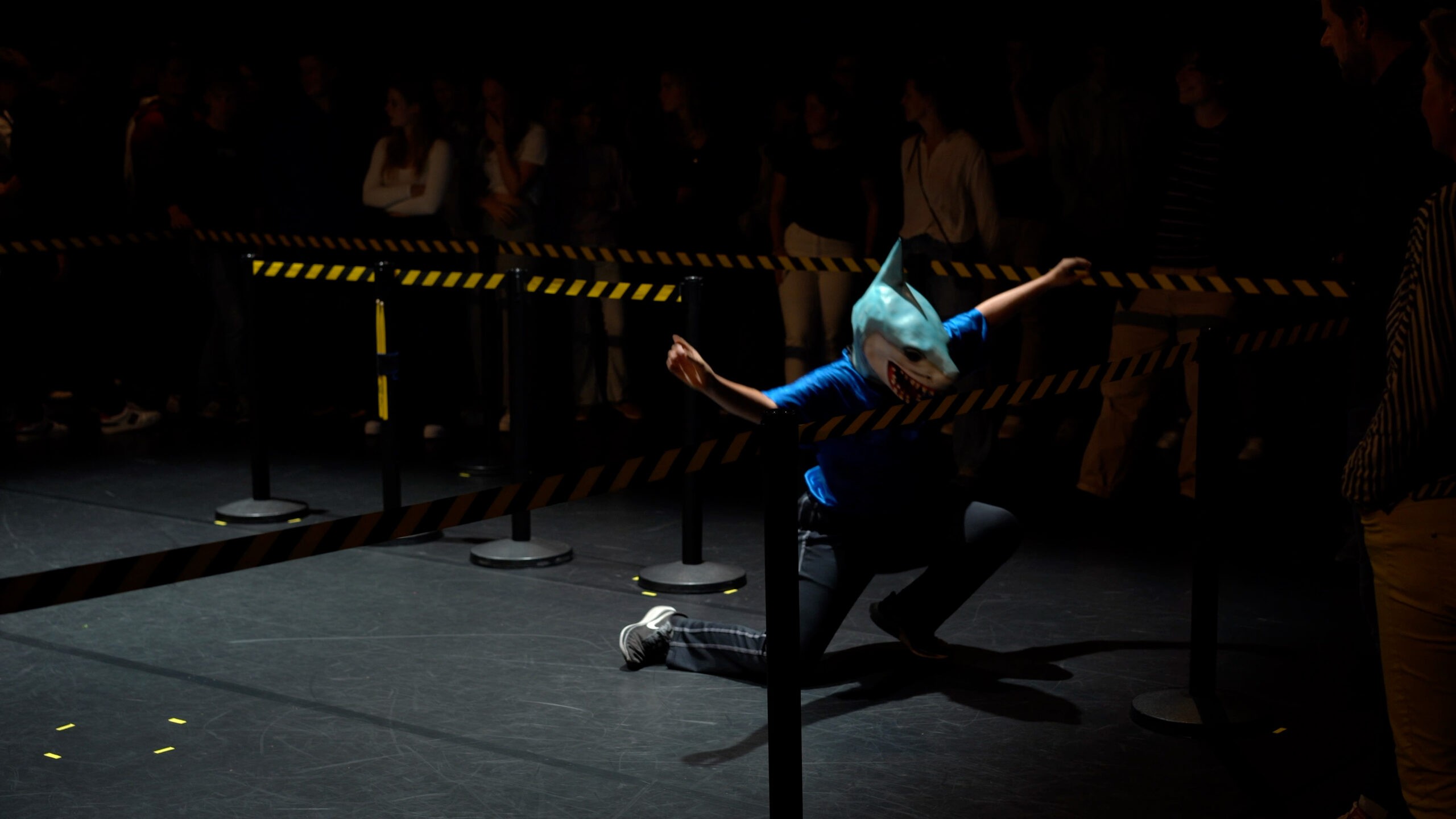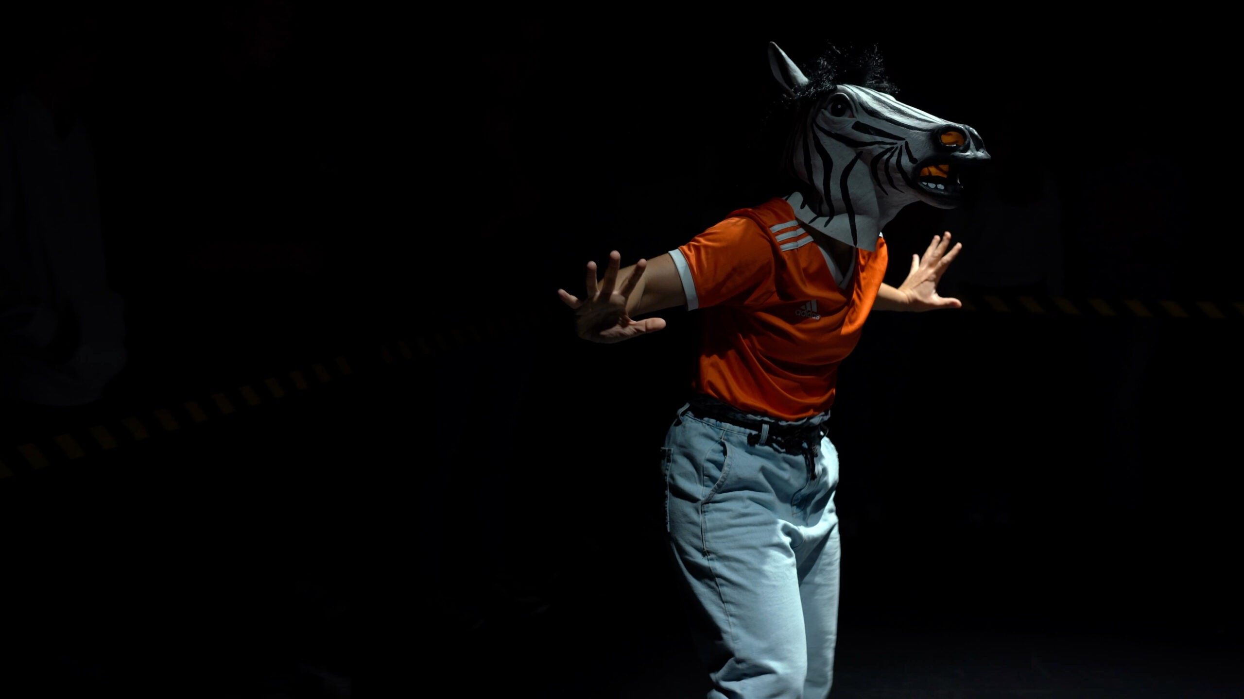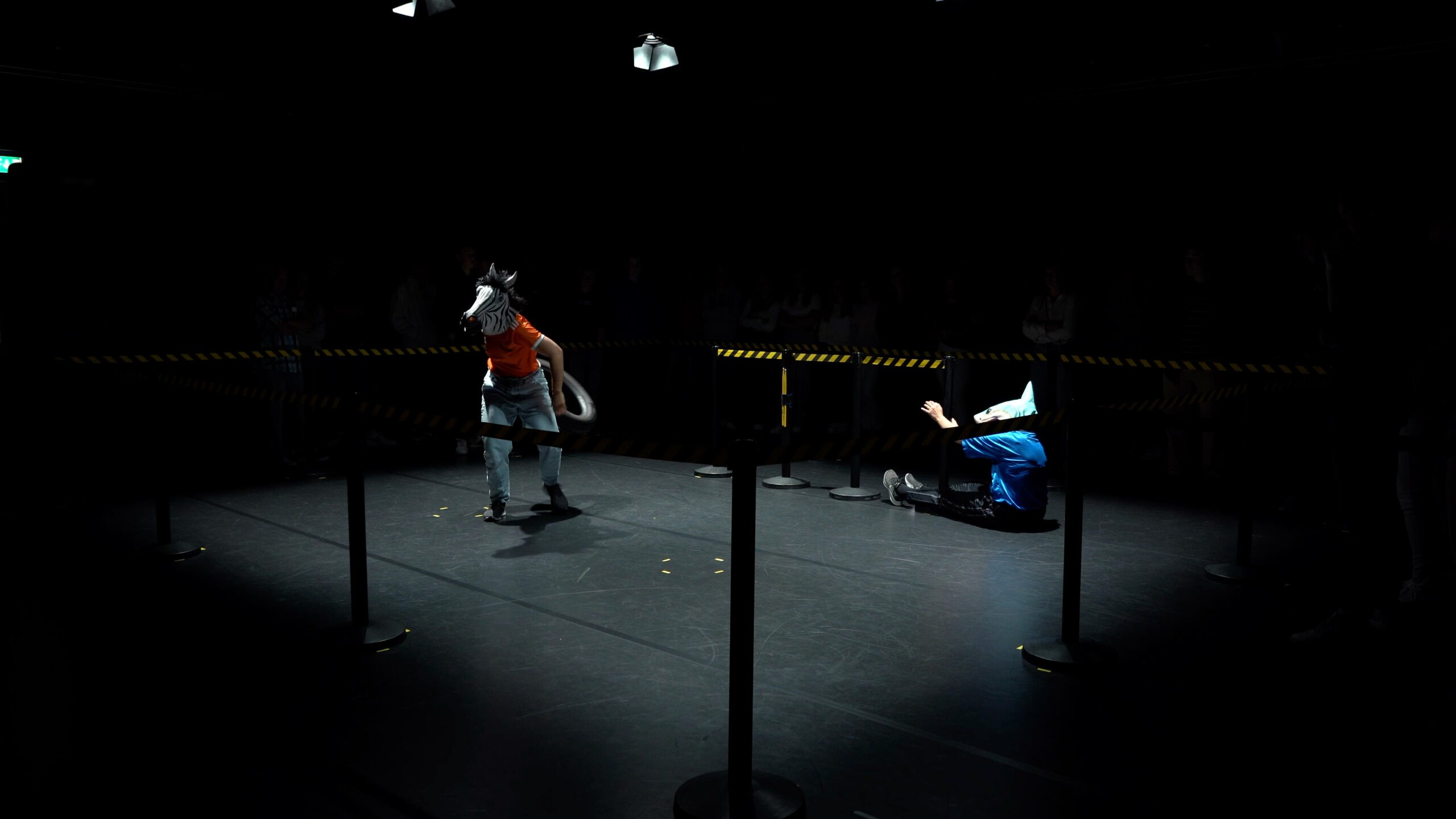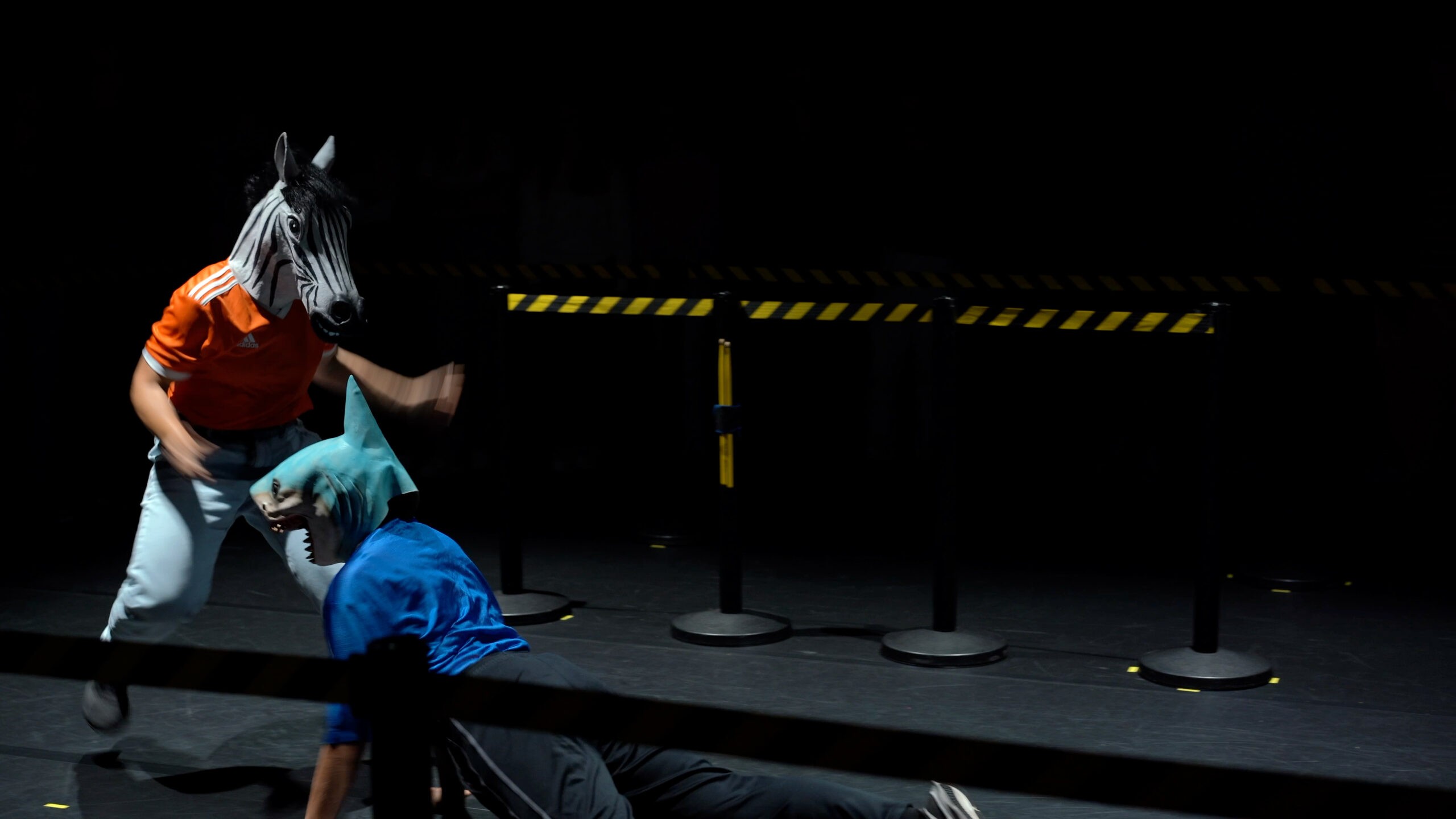 Jungle the Future portrays the science-fiction journey of a humanized zebrA and sharK that escape their habitats to settle in cement territories: our cities. In the heart of a metropolis – amidst its grey neighborhoods- they confront the rites and customs of humans. In an effort to blend in they eat cigarettes, dress-up in the corners, get drunk on salt and gallop on rollers. The scandalous dream of the zebrA-lexandra Bellon, and of the sharK-arla Isidorou, is to integrate into human society. The audience, as if visiting a zoo or a crime scene, stays safely behind the lines. They witness their struggles, nostalgia, dreams for a better life and irresistable stamina to keep trying.