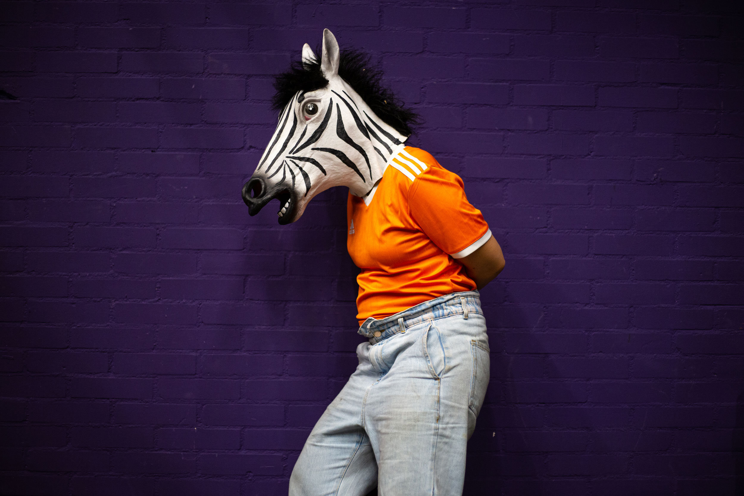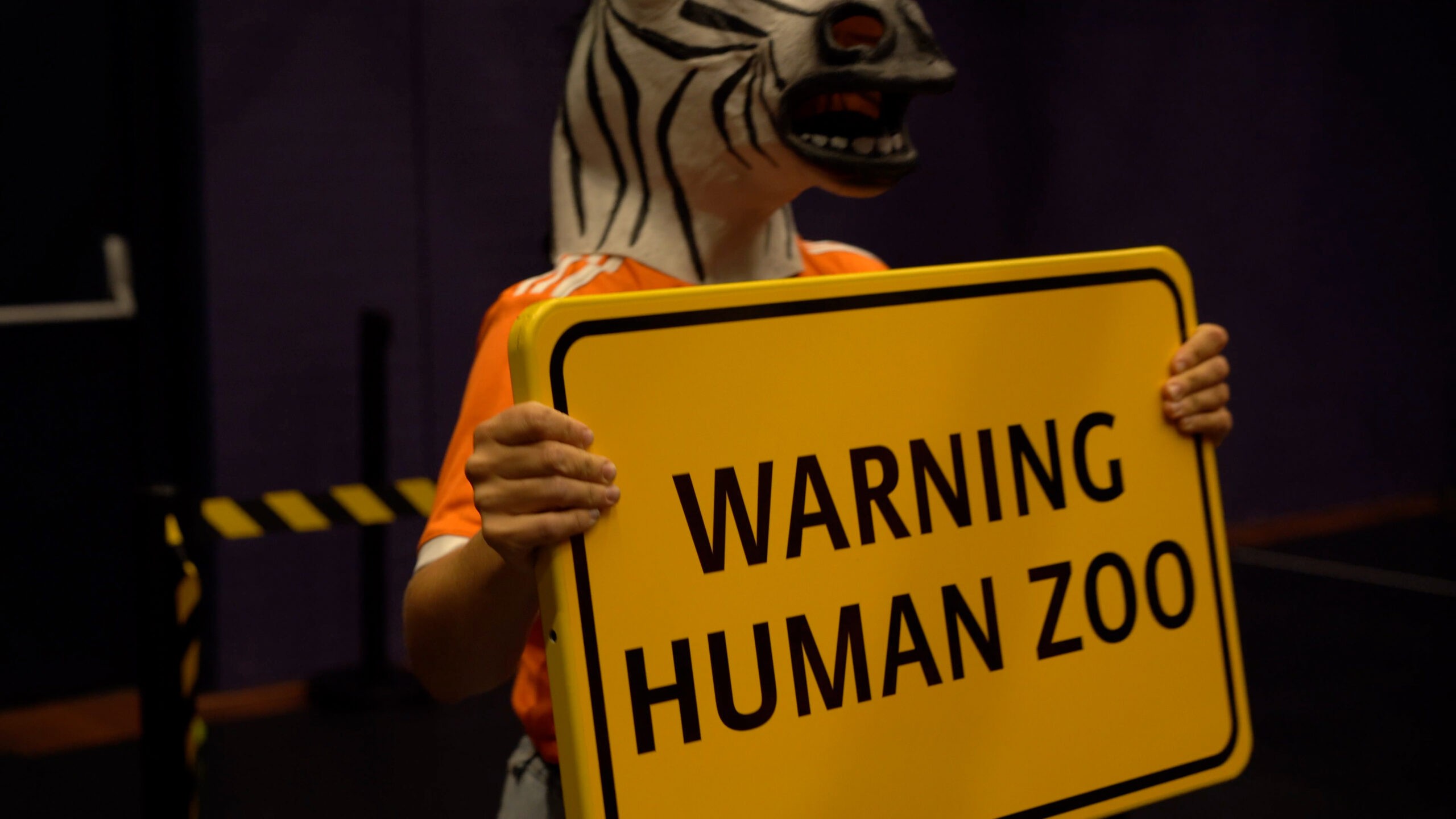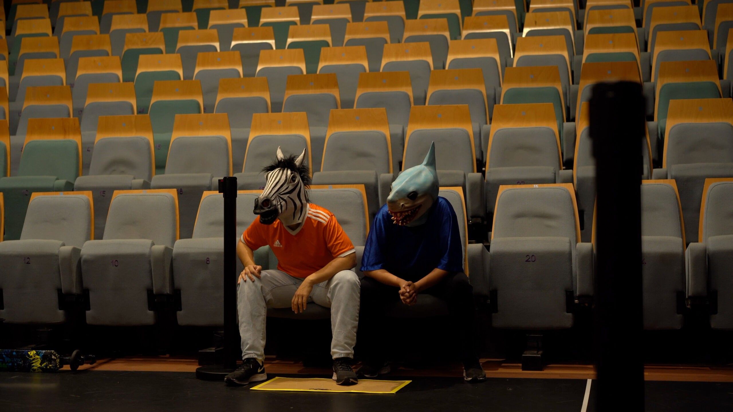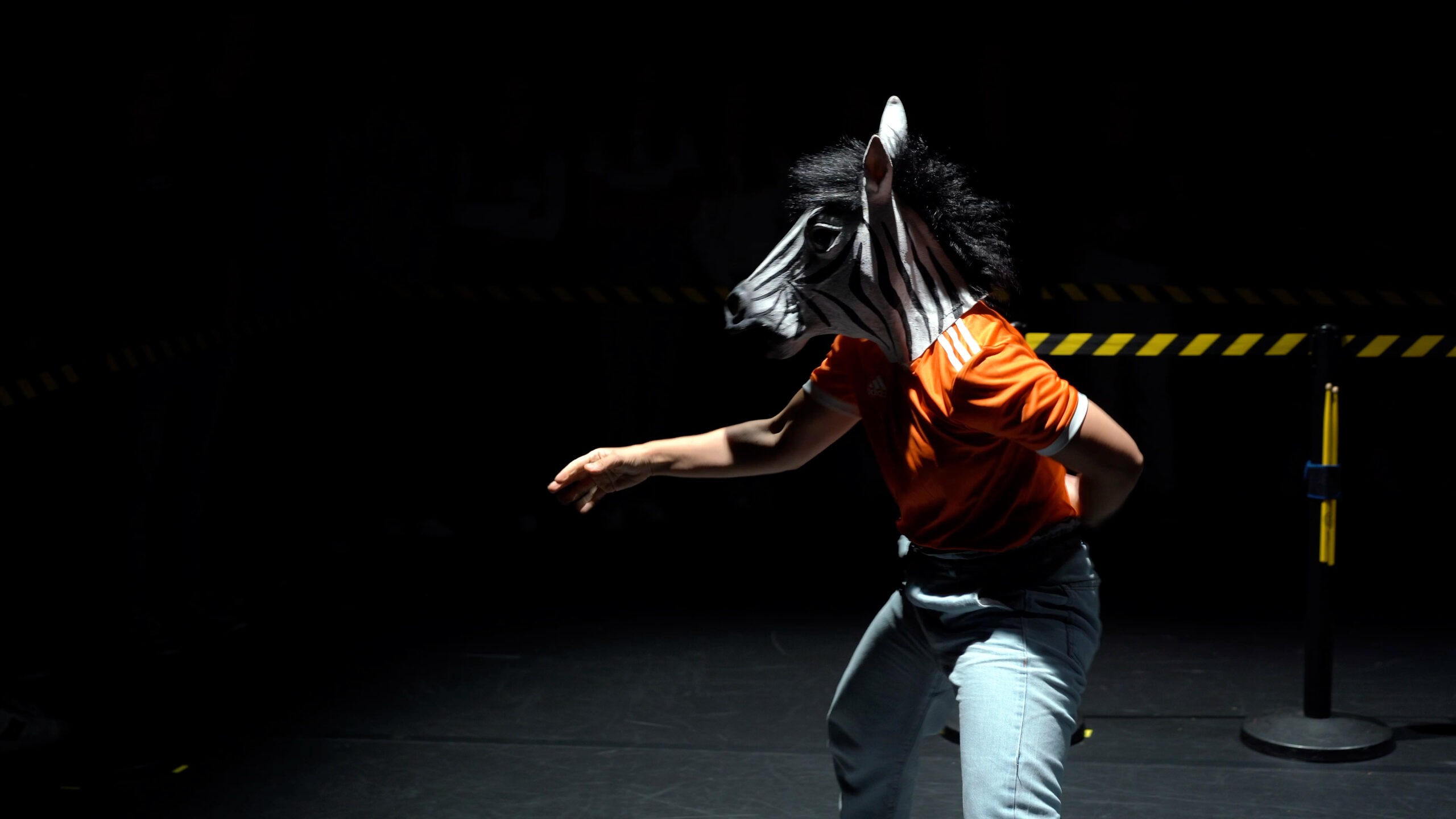 Jungle the Future portrays the science-fiction journey of a humanized zebrA and sharK that escape their habitats to settle in cement territories: our cities. In the heart of a metropolis – amidst its grey neighborhoods- they confront the rites and customs of humans. In an effort to blend in they eat cigarettes, dress-up in the corners, get drunk on salt and gallop on rollers. The scandalous dream of the zebrA-lexandra Bellon, and of the sharK-arla Isidorou, is to integrate into human society. The audience, as if visiting a zoo or a crime scene, stays safely behind the lines. They witness their struggles, nostalgia, dreams for a better life and irresistable stamina to keep trying.