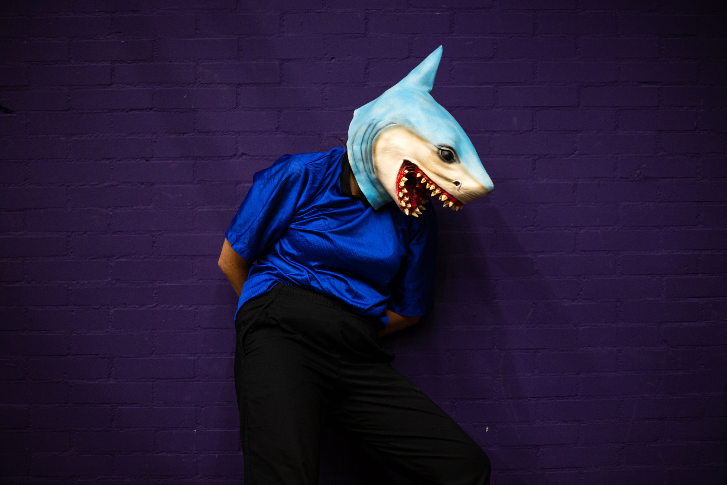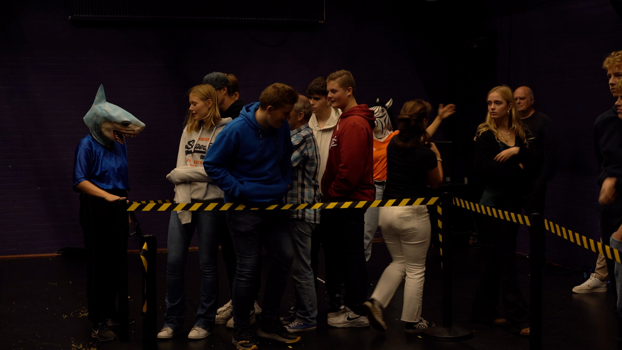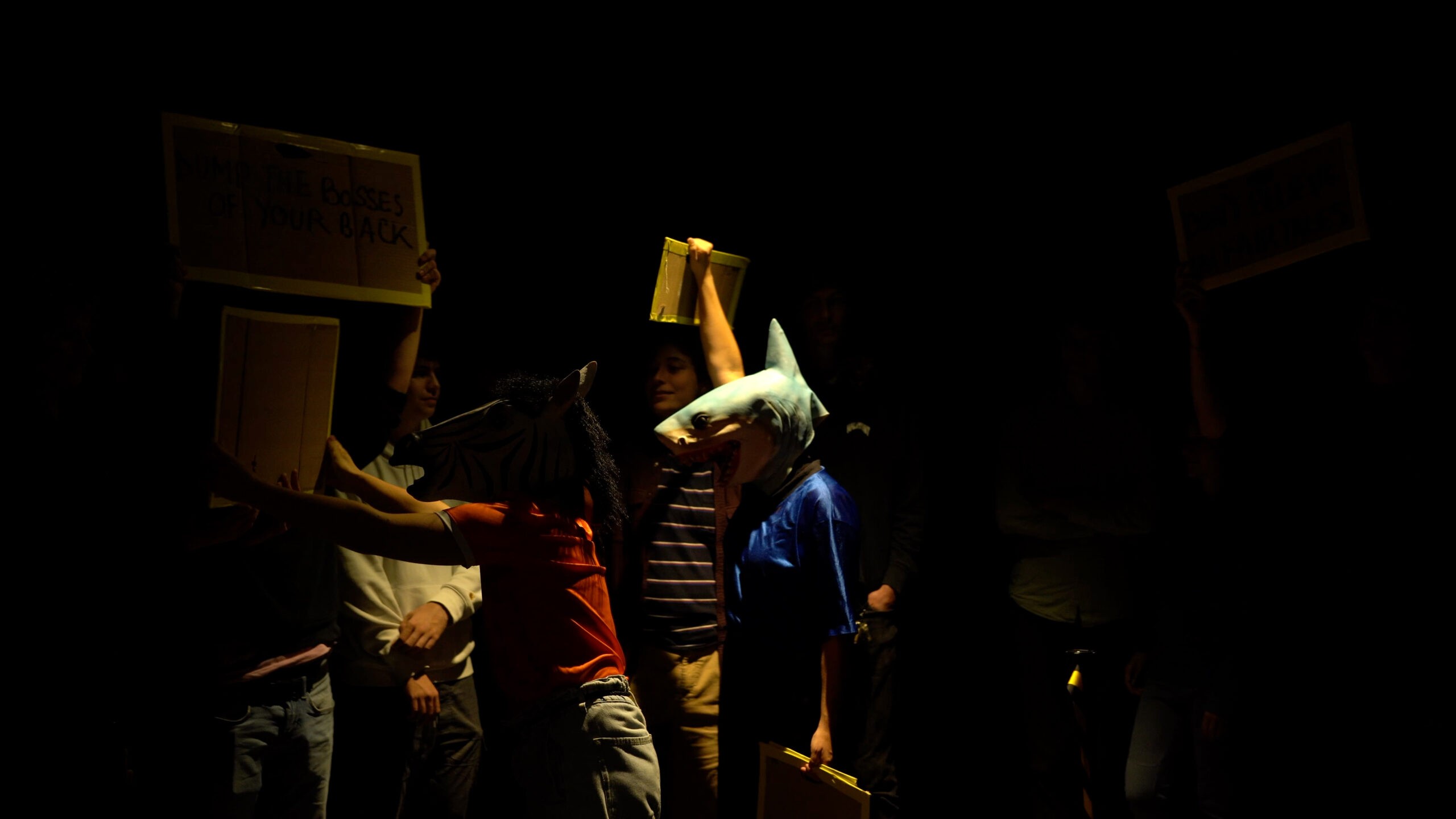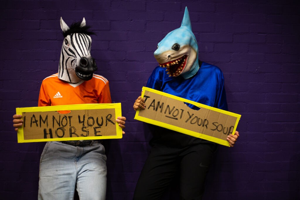 Jungle the Future portrays the science-fiction journey of a humanized zebrA and sharK that escape their habitats to settle in cement territories: our cities. In the heart of a metropolis – amidst its grey neighborhoods- they confront the rites and customs of humans. In an effort to blend in they eat cigarettes, dress-up in the corners, get drunk on salt and gallop on rollers. The scandalous dream of the zebrA-lexandra Bellon, and of the sharK-arla Isidorou, is to integrate into human society. The audience, as if visiting a zoo or a crime scene, stays safely behind the lines. They witness their struggles, nostalgia, dreams for a better life and irresistable stamina to keep trying.